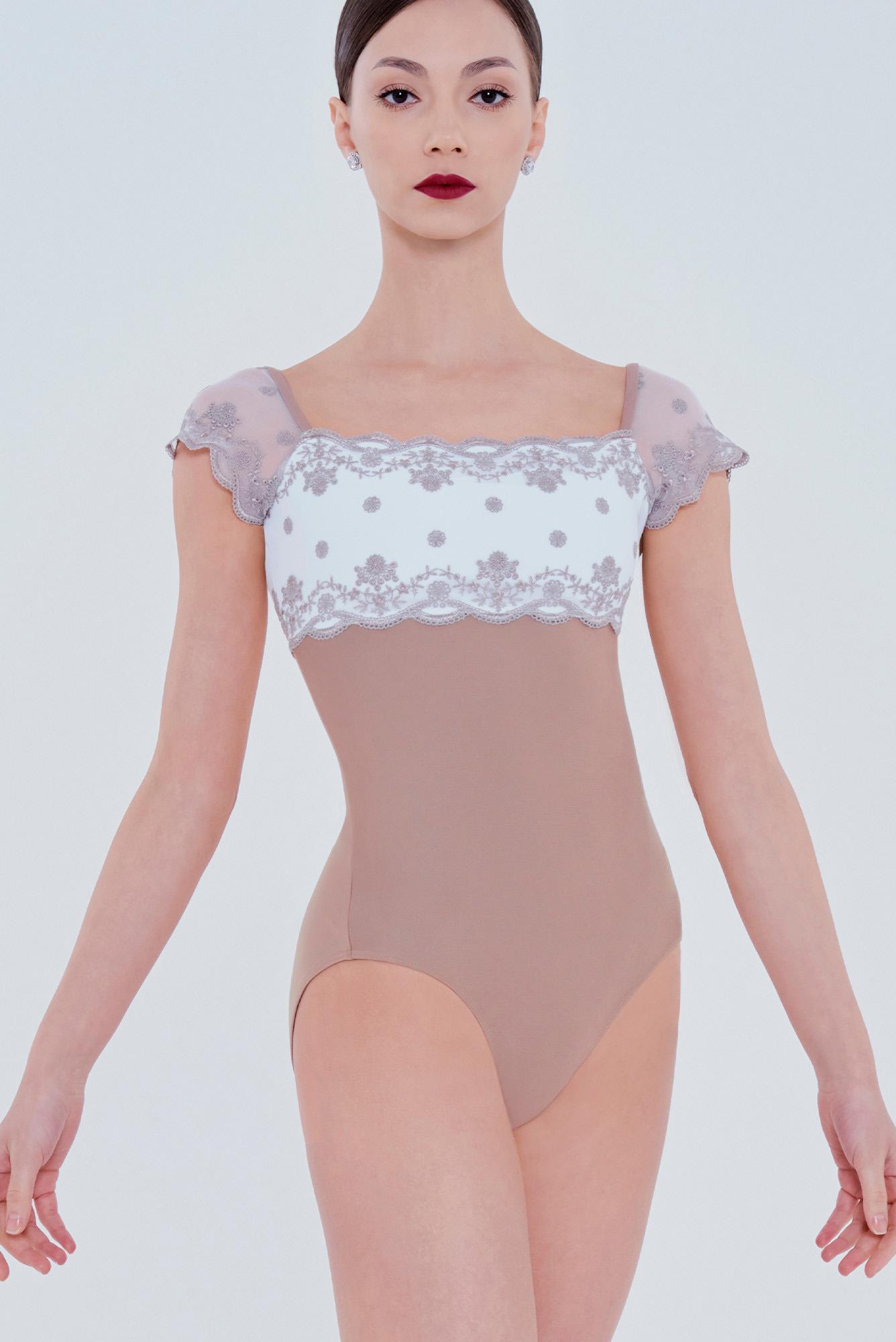 Wear Moi Narcisse balettipuvussa on kukkakirjailtu valkoinen yläosa ja lyhyet läpikuultavat hihat. Hihoista selkäpuolelle jatkuva kirjailtu verkkokangas ja syvä avonainen selkä antavat tanssijan linjojen kauniisti näkyä.