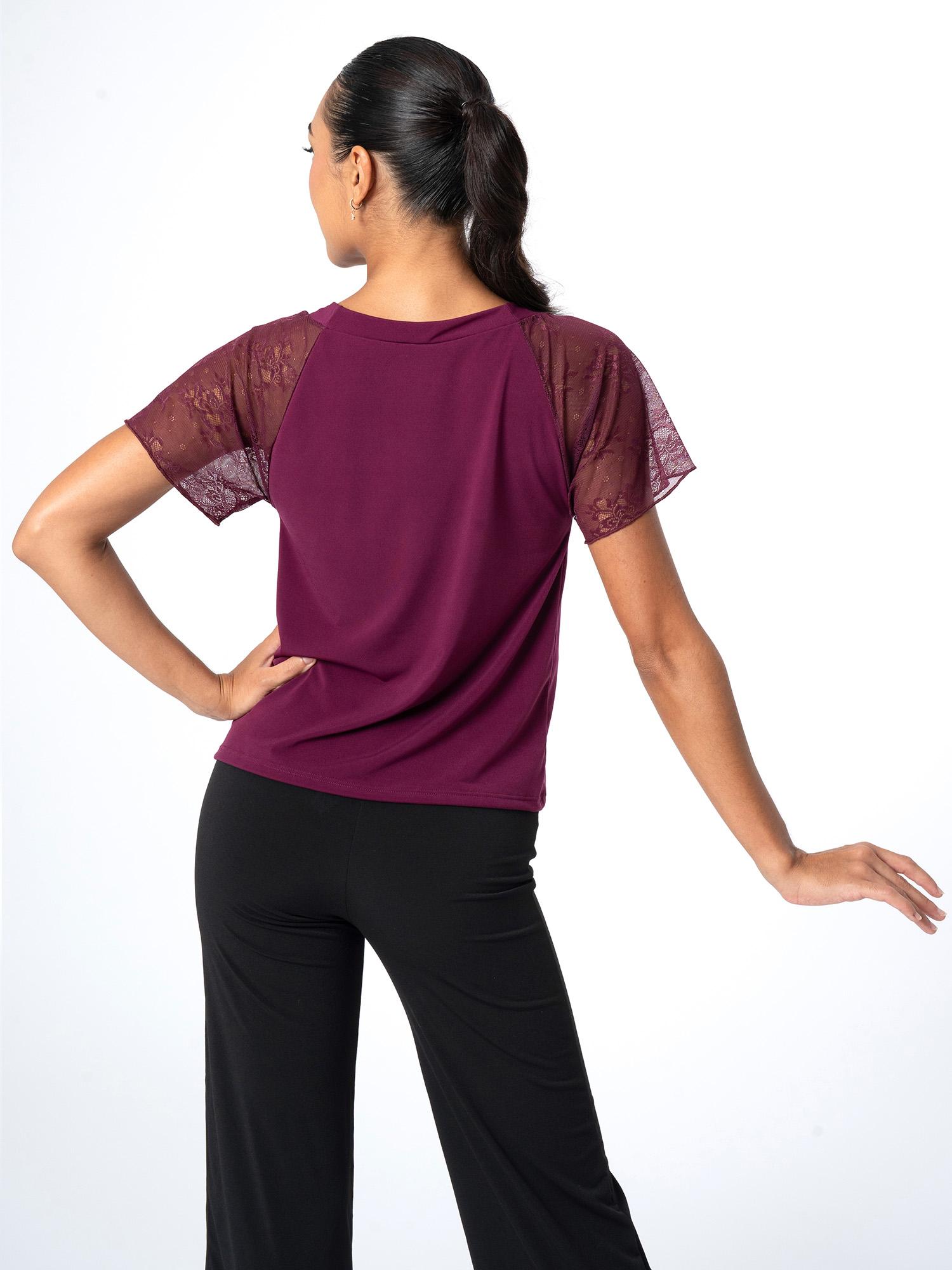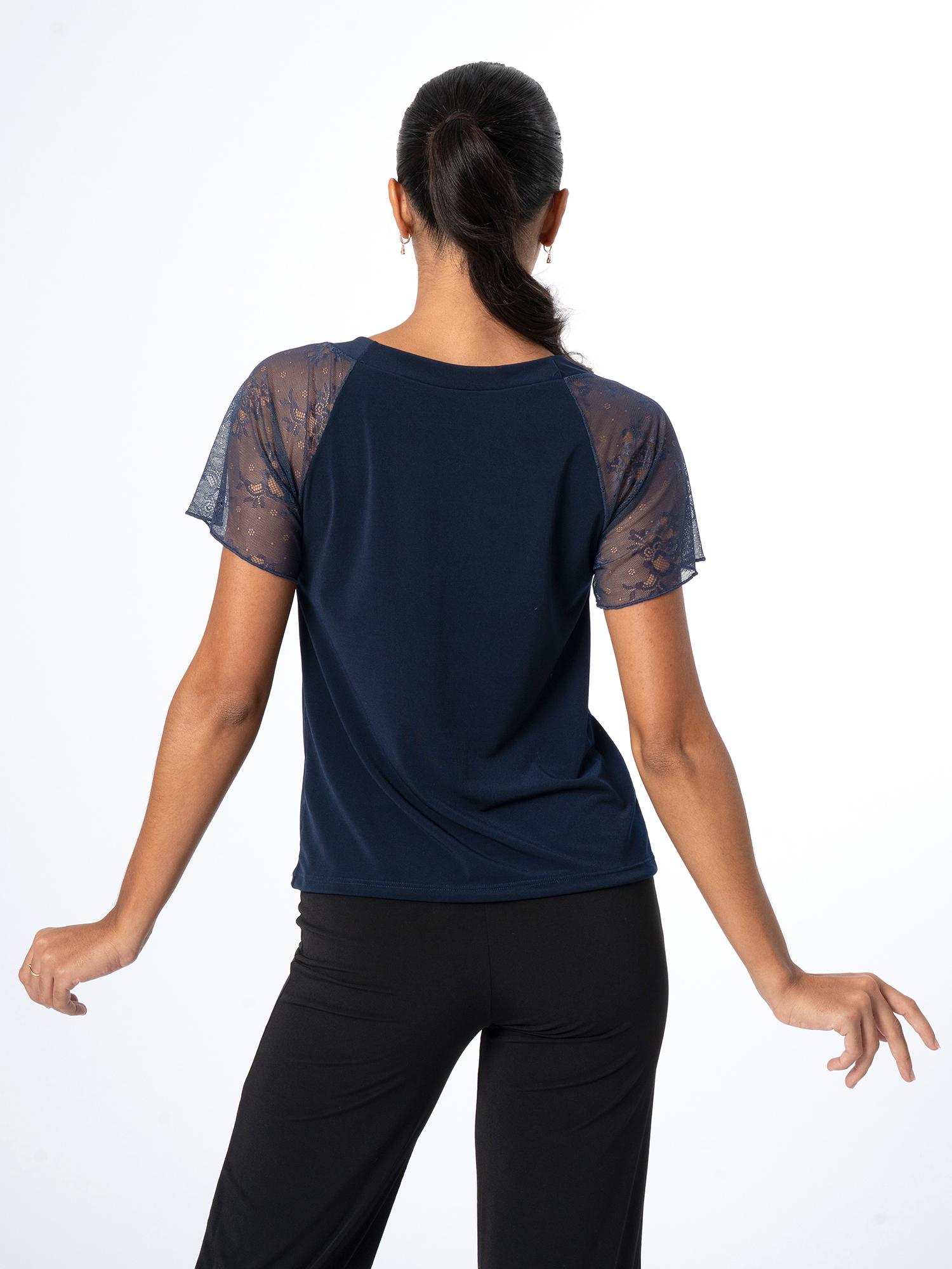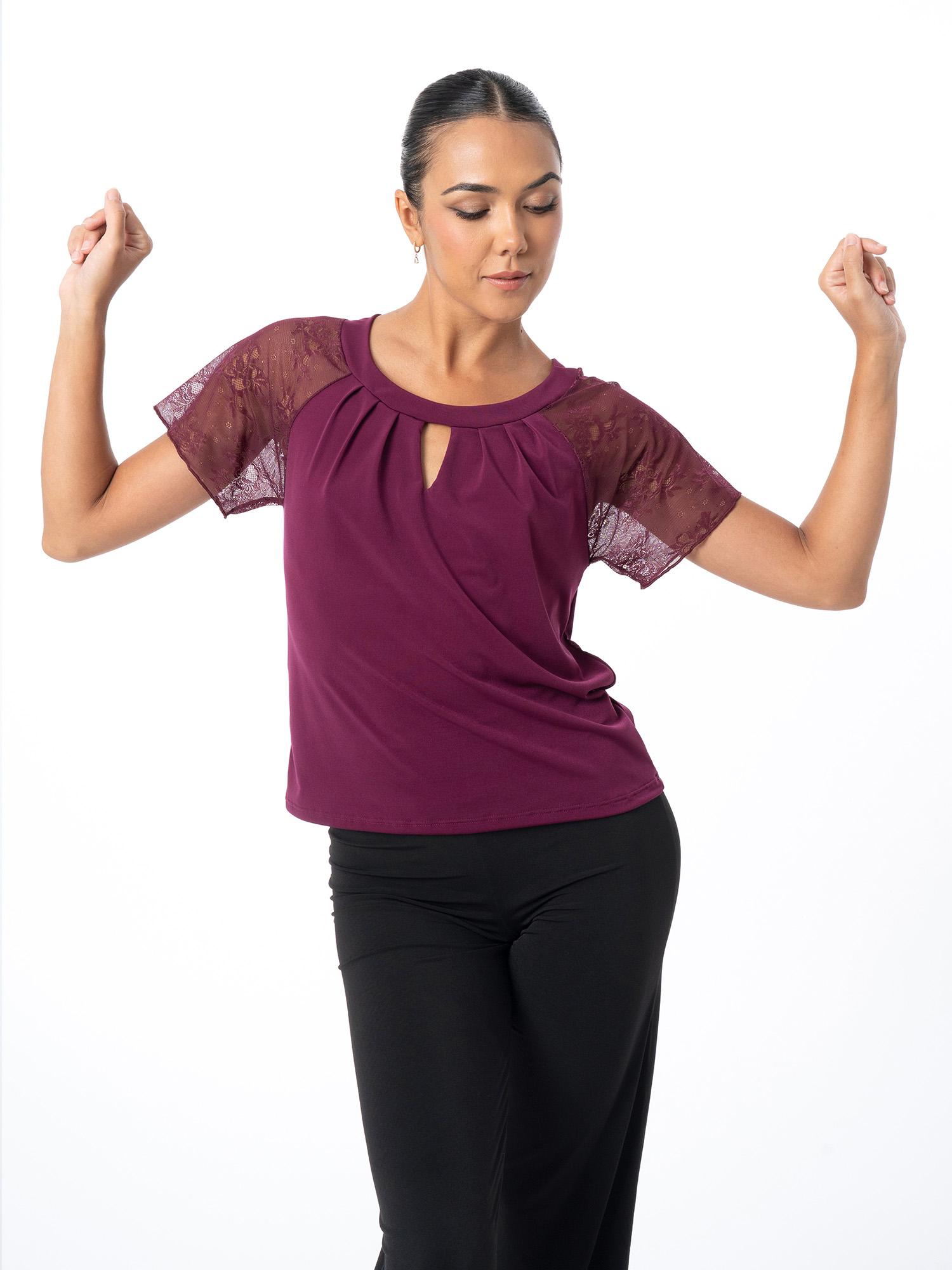Lyhythihainen tanssipaita rypytetyllä pääntiellä ja pienellä V-leikkauksella edessä. Paidan hihat ovat läpikuultavaa kukkakuvioitua pitsiä.