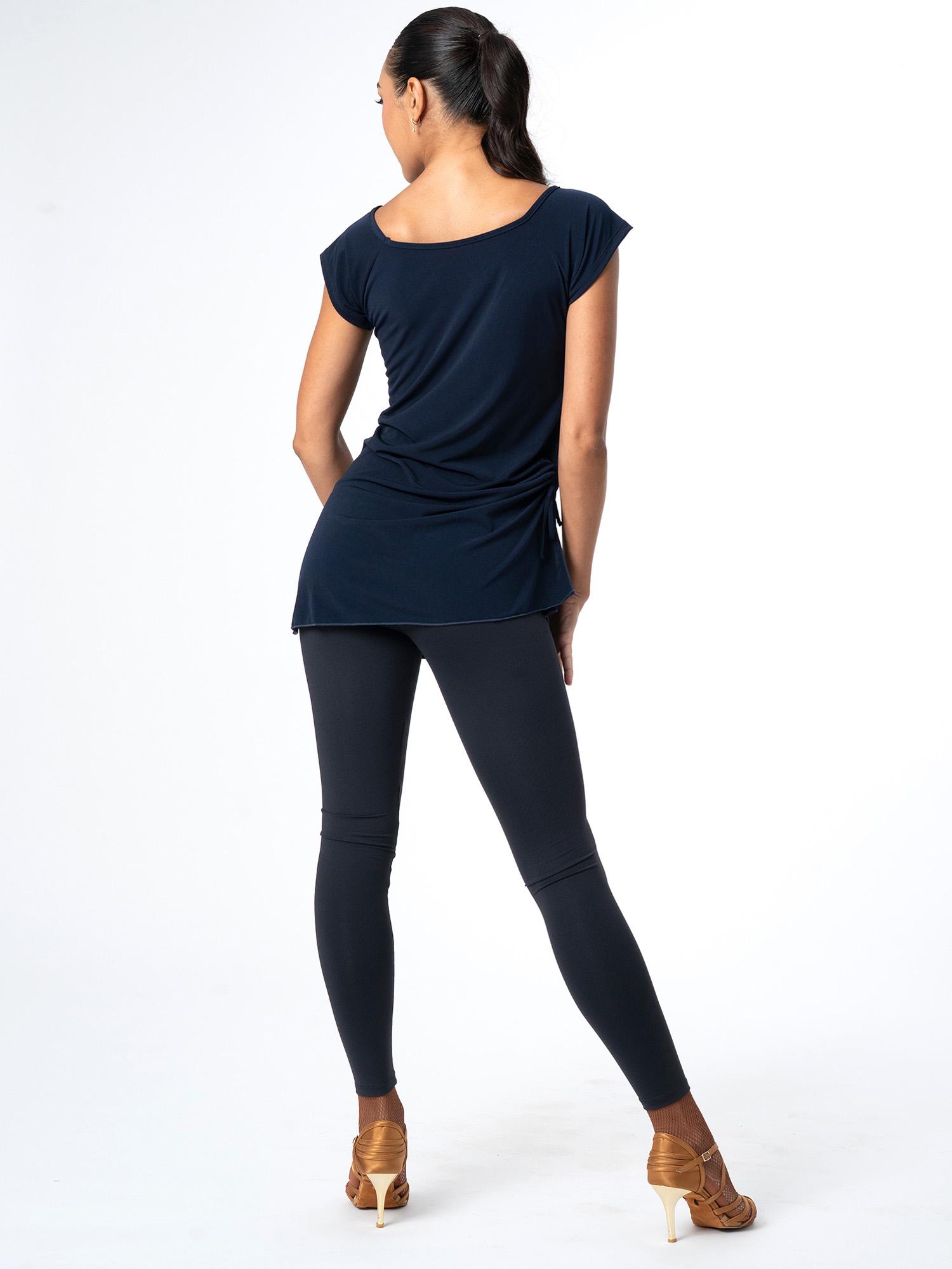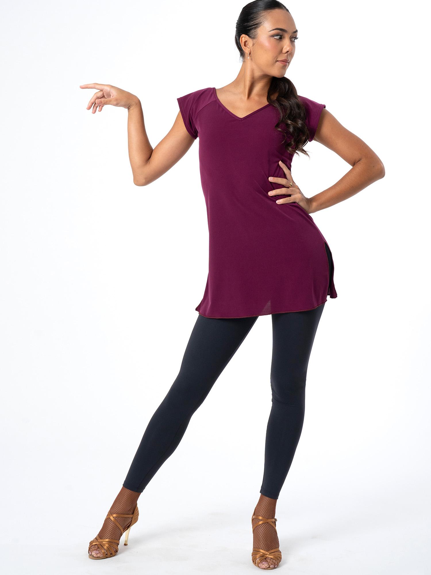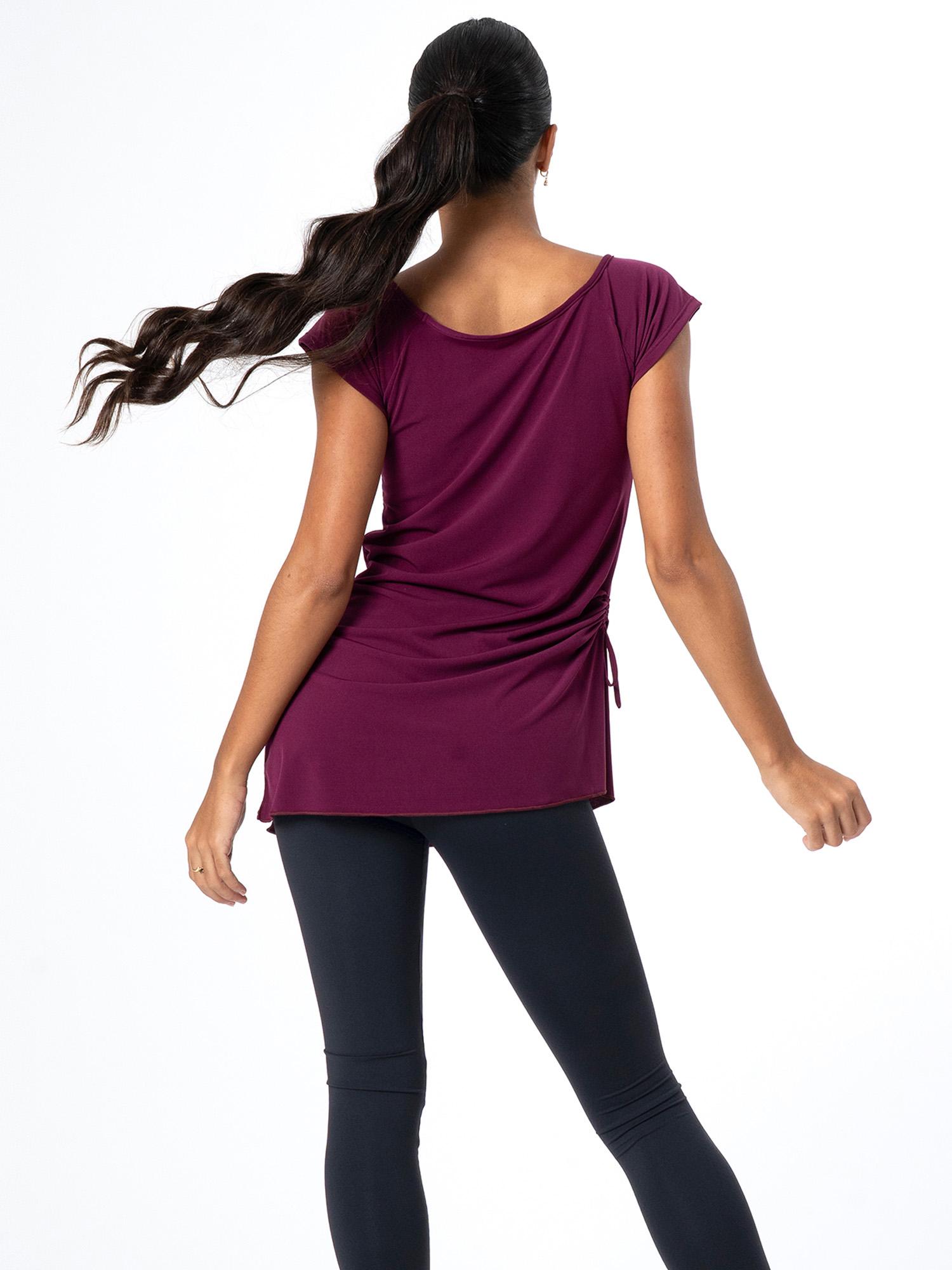 Pitkänmallinen paita / tanssitunika lyhyillä hihoilla ja V-pääntiellä. Paidan oikealla sivulla on rypytys, jolla helman pituutta voi säätää nauhoista kiristämällä ja solmimalla.