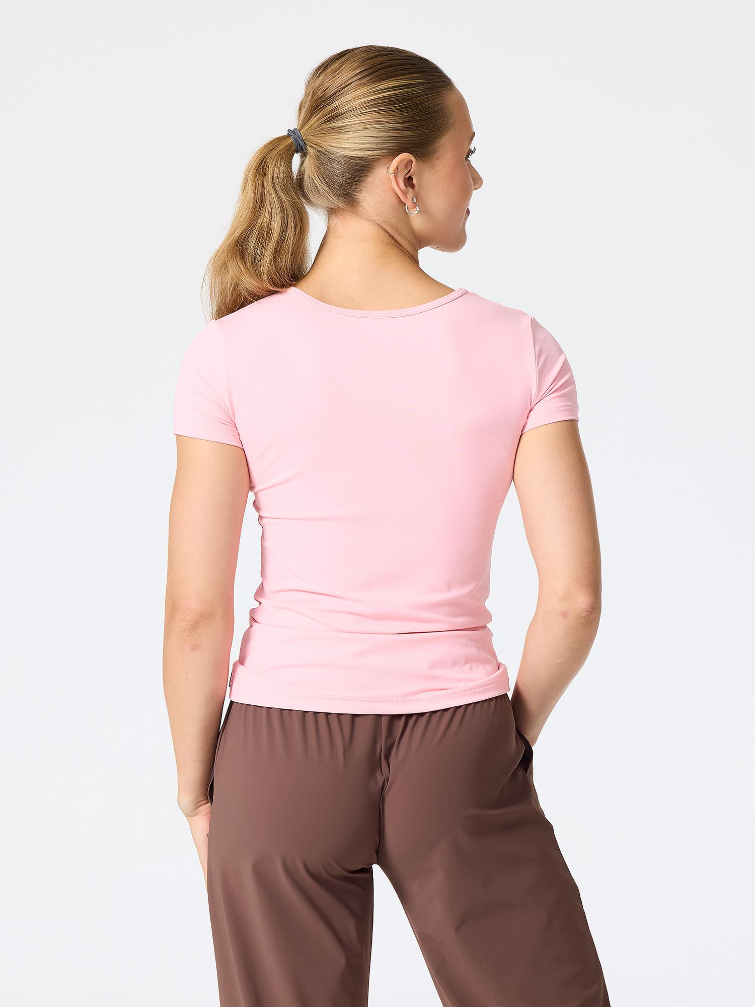 Lyhythihainen peruspaita. Materiaali napakka, hengittävä ja joustava, pinnaltaan liukas mutta ei kiiltävä micromeryl, tekninen urheilumateriaali.