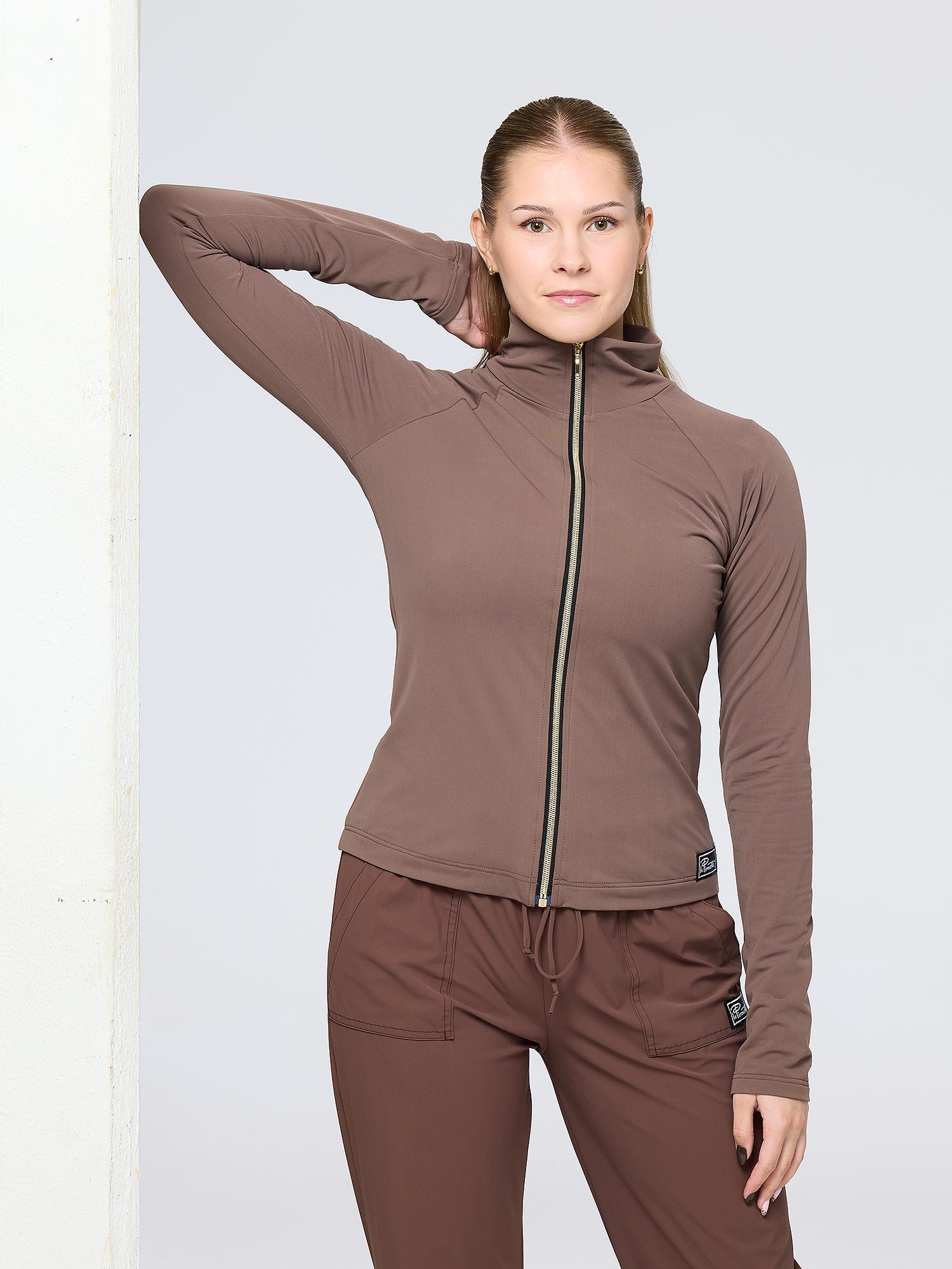 Kaunis ruskeansävyinen aikuisten takki pehmeää soft vuelta -materiaalia. Upeana yksityiskohtana kullanvärinen kimallevetoketju, jonka vetimessä strassi.