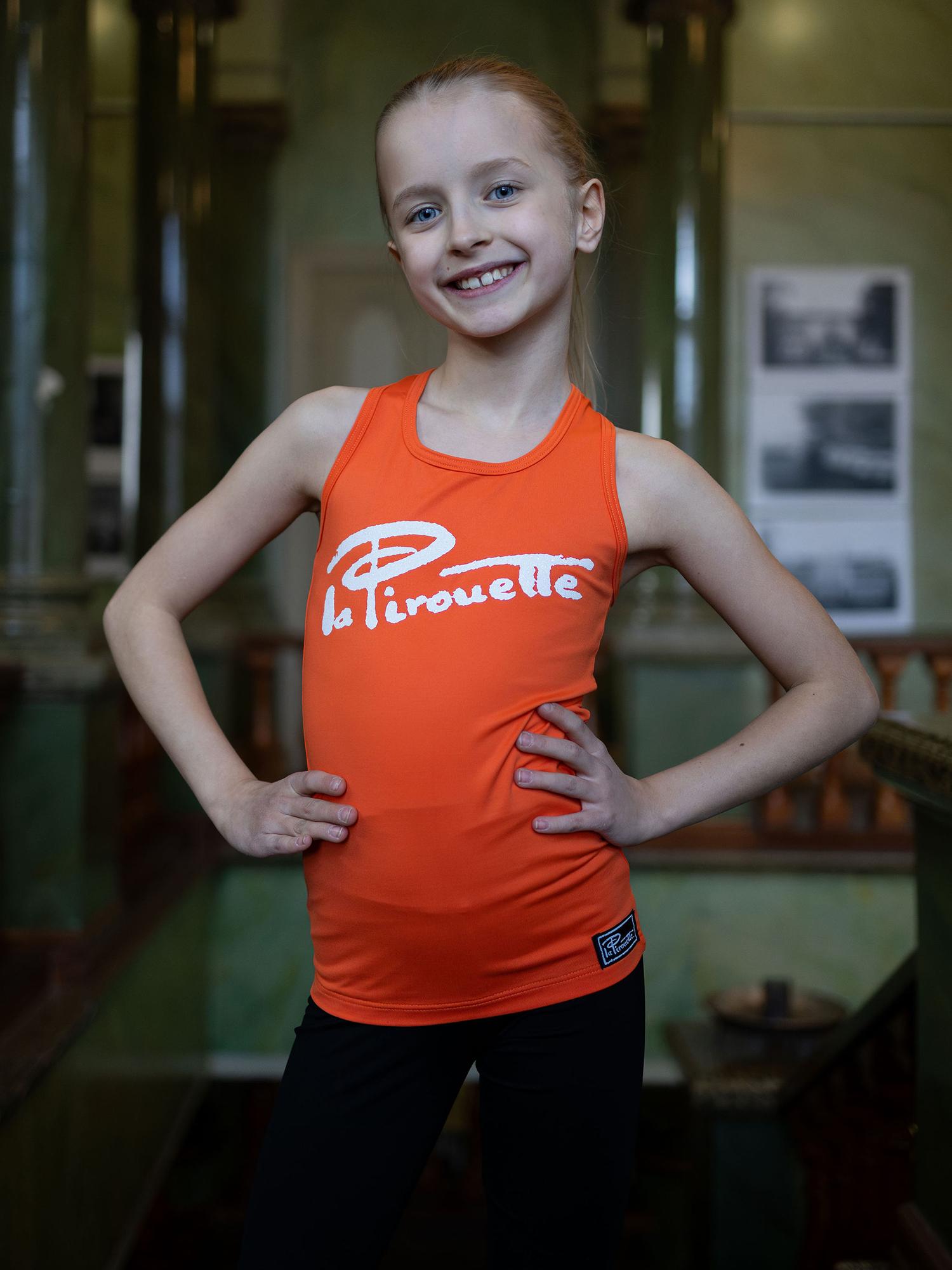 Pirteän oranssi painijaselkäinen toppi valkoisella ”la Pirouette” kimalleprintillä. Kausiväri saatavilla vain rajoitetun ajan!